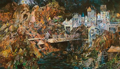 While the angular planes of the landscape are lushly and loosely painted, this contrasts with his treatment of human figures. They are small in relation to the landscape and tightly delineated. His figures are the more telling than his deceptively loose, chaotic landscapes. You can see it in the hard edges he creates, seemingly by painting in layers over strips of paper that he then pulls off, how precisely controlled the enviorns are.